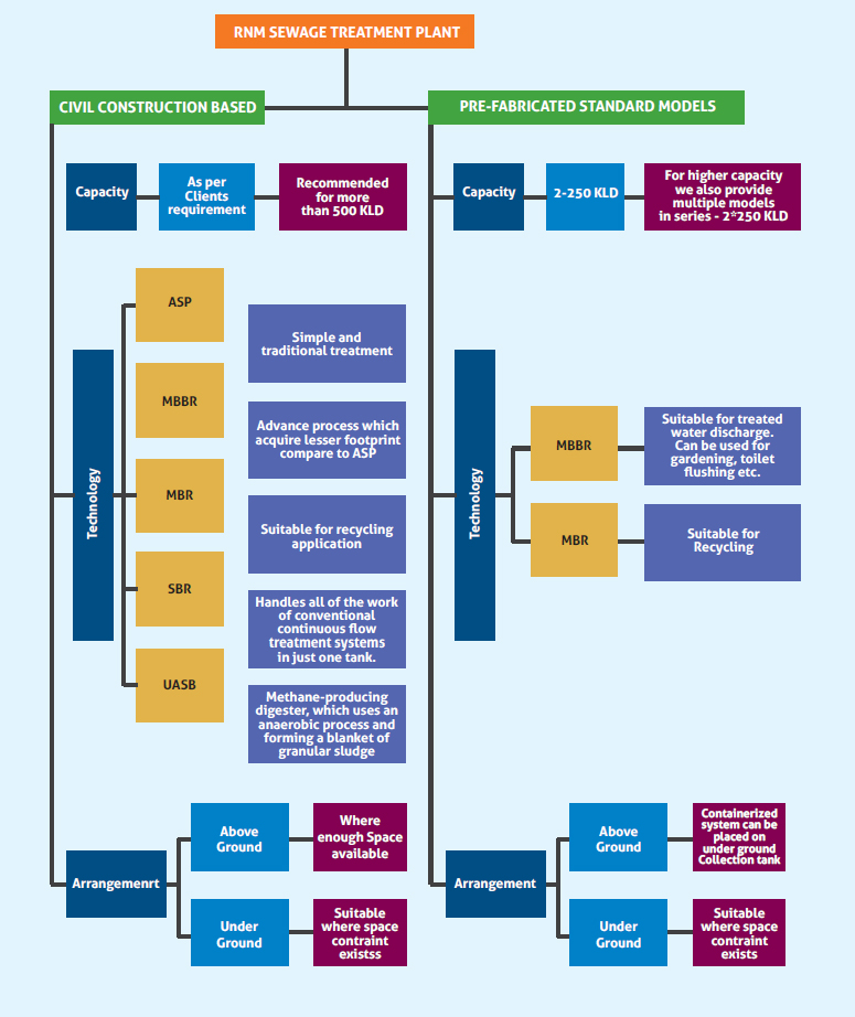 R N M has developed standardized models based on MBBR and MBR Technologies, which are the most advanced state of the art technologies nowadays.